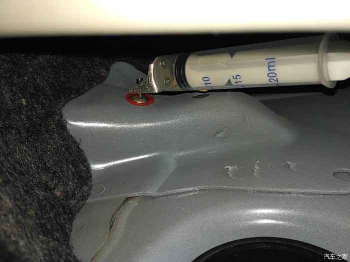 手套箱的右侧有个缝隙,这是扒在下面往上看。钉子需要先掰一个小小的角度,正式安装前先一点点地试,把钉子的角度掰出来。装上箱盖,然后车架的孔上涂些玻璃胶(图中红色,其实什么颜色都行),把组装好的固定点装进去。
