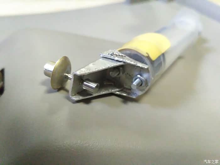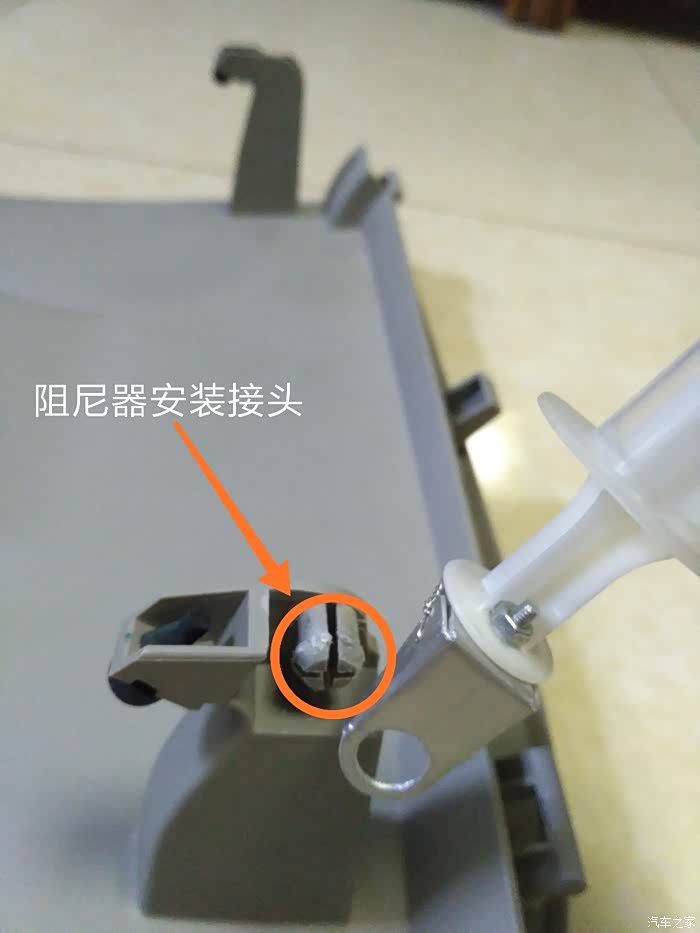 箱盖打开然后往后拽,就能拆下来。找厚度1毫米左右的铝片,做成两个支架,用小螺丝螺母固定在一个注射针筒的两端,制成阻尼器。