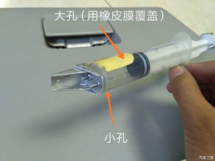 小通气孔做在针筒的端头,作用是箱盖打开的过程中使空气节流形成阻尼。大通气孔做在针筒半腰附近,外面覆盖橡皮膜,用透明胶带固定,形成单向通气的功能,箱盖关上的前2/3行程大通气孔放气消除阻尼,后1/3行程大通气孔失去做用,恢复阻尼,防止关上时用力过猛。做通气孔尤其是小孔,要从小到大逐渐加大,感受阻尼的程度。橡皮膜可以从口罩的通气阀里拆。