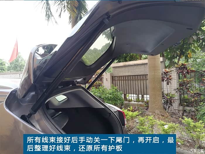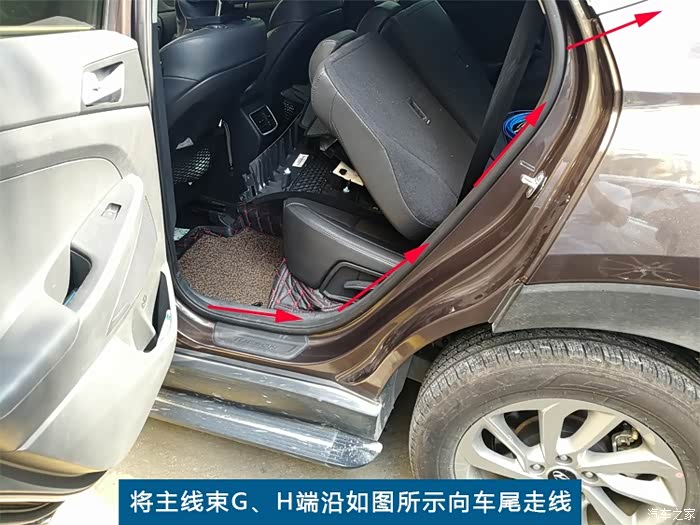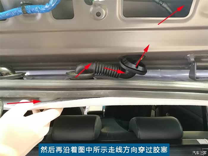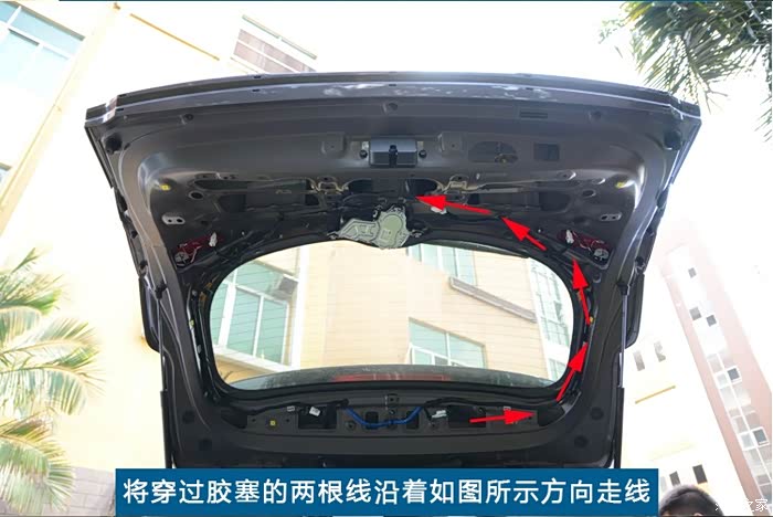 这样看的明白把,将电动尾门的线沿着箭头方向走