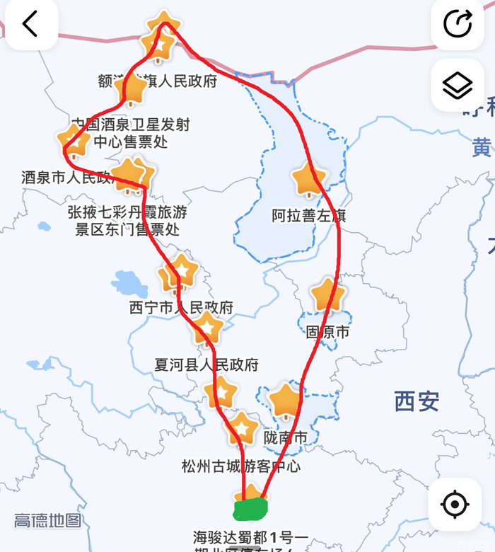 路线:成都—绵阳市—剑阁县—青川县—武都区—武都钟楼公园【革命历史纪念馆】—陇南市西和县—天水市—庄浪县—泾源县—固原市—固原博物馆—固原市三里铺清真寺—固原古城遗址—固原西湖公园—固原市同心县—中宁—银川市永宁县—阿拉善左旗—阿拉善博物馆—腾格里沙漠天鹅湖—阿拉善左旗定远营—阿拉善左旗延福寺—阿拉善和硕特旗亲王府—阿拉善左旗阿拉善盟—乌力吉苏木—阿拉善盟阿拉善右旗—额济纳博物馆—额济纳湿地公园—额济纳旗额济纳胡杨林—居延海—中国策克口岸—东风镇—酒泉卫星发射中心金塔胡杨林—嘉峪关城楼—嘉峪关长城博物馆—嘉峪关悬臂长城——嘉峪关长城第一墩—酒泉公园—左宗棠陈列馆—肃州植物园—酒泉博物馆—酒泉市—张掖市高台县—张掖丹霞地质公园【七彩丹霞】—张掖市张掖国家湿地公园—张掖大佛寺—甘肃张掖木塔.—张掖博物馆—马蹄寺景区—民乐县—门源县—西宁市塔尔寺景区—青海省博物馆—西宁人民公园—海东市—尖扎县—夏河县拉卜楞寺—天水市—成都