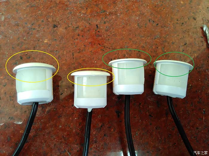 准备探头,探头后面有标注按装朝向(图中看到不同颜色的圈圈没有?这些探头盖不规则的,这样可以方便调整安装角度,之前看到有车友就是安装后探头朝下了,所以经常误报,用这类型的探头就能很好的把握探头角度)