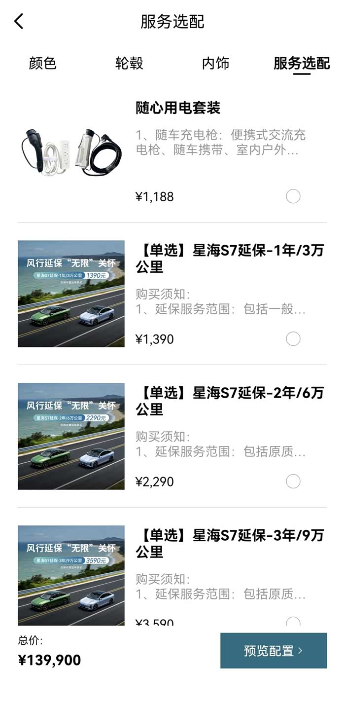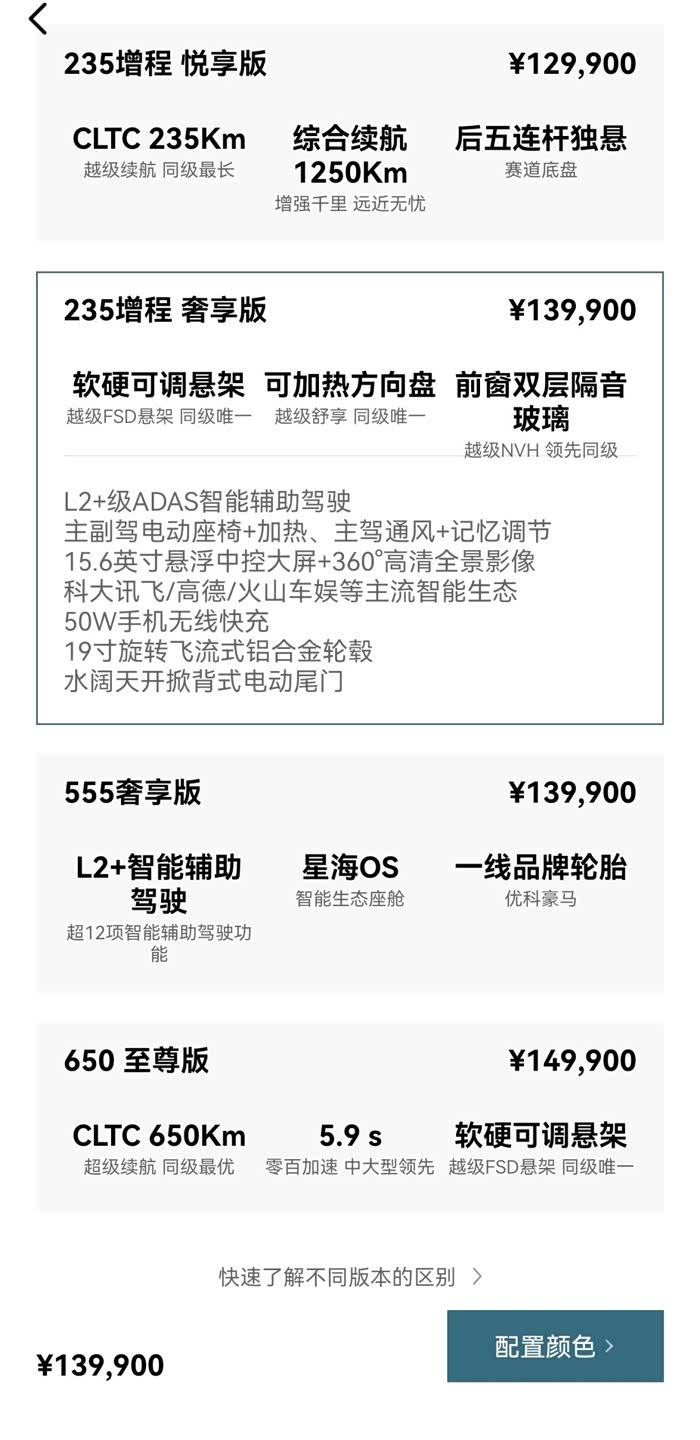 纠结的那段时间,有朋友说一般增程比同配置的纯电会便宜几千块,星海S7一样价格,这有点离谱,我倒觉得挺正常,配置差不多,悬架升级了啊,增程奢享版可是FSD逍遥悬架,对比那台555公里纯电奢享版,确实滤震效果更好。