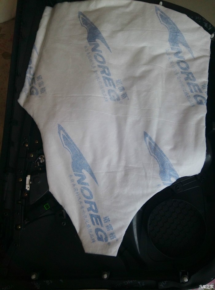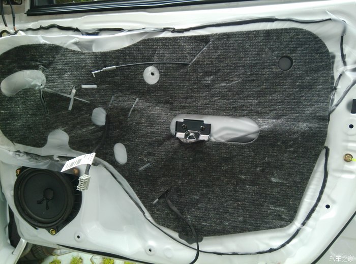 5 拆开后,看看原车的样子,还放了隔音棉,虽然质量不怎么滴,但是至少放了,还是比较亲民,比起日韩车好多了,朋友的车拆开后直接就一片塑料,而且门板单层的,BYD门板是双层的