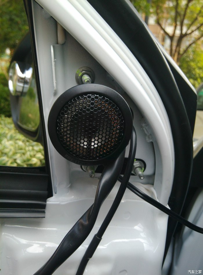 10 ,安装高音喇叭,拆的时候要主要,罩子有一个卡口,然后把两个10号螺丝拆掉,用十字起拧下高音喇叭,看看原车的高音喇叭,注意,十字螺丝拧掉后上面铁片和喇叭是用胶水粘的,用力一橇就下来了