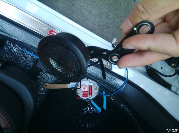安装高音喇叭,高音喇叭是单独的一个接头,因为有功放,这里不要弄坏了,如果大家尝试的不接分配器,可以直接在这里接高音
