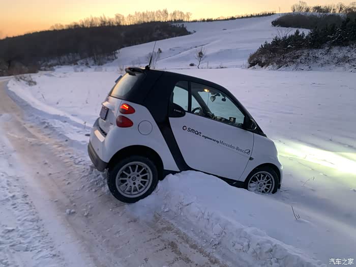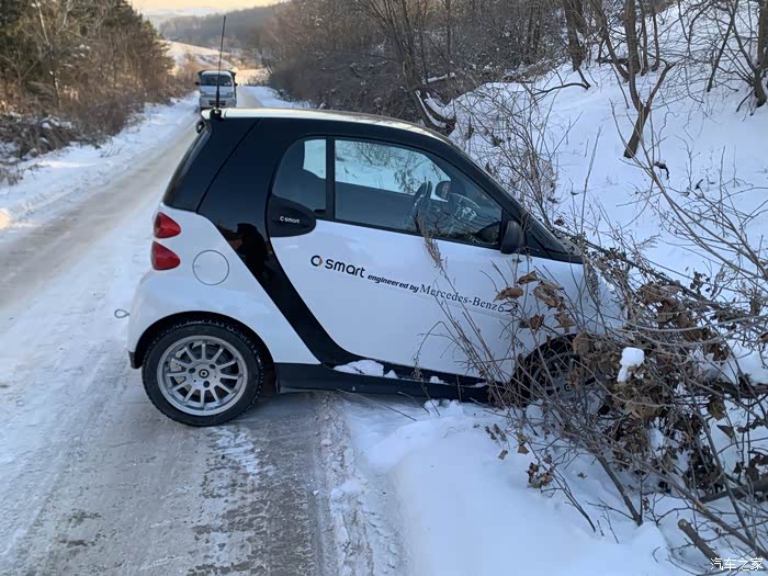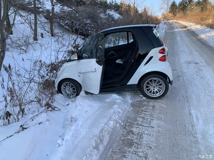 在一个寒冷的冬天的凌晨,我开着心爱的smart,去农村的朋友家串门,早上四点钟出发,快亮天的时候,到了一个人烟稀少的小路,赶上上坡,路特别滑,稍微收油的时候,车辆突然向左滑入旁边的稻田地。