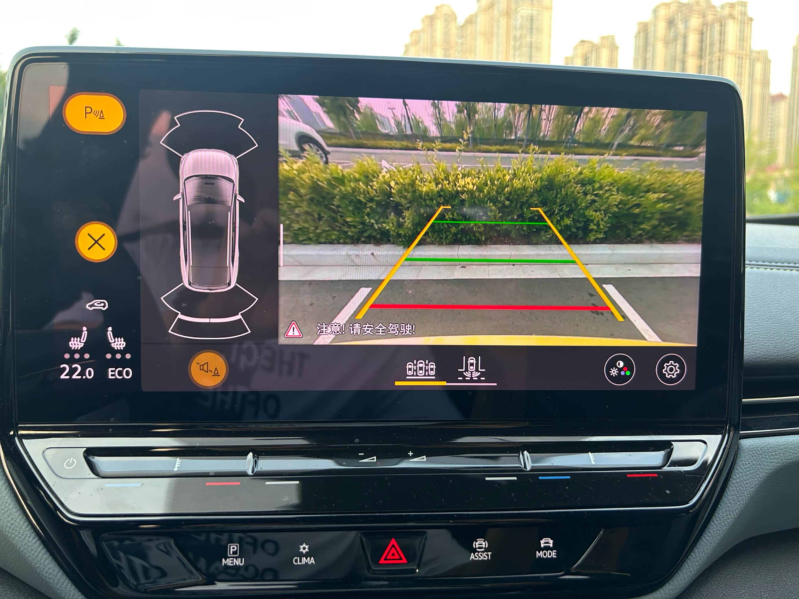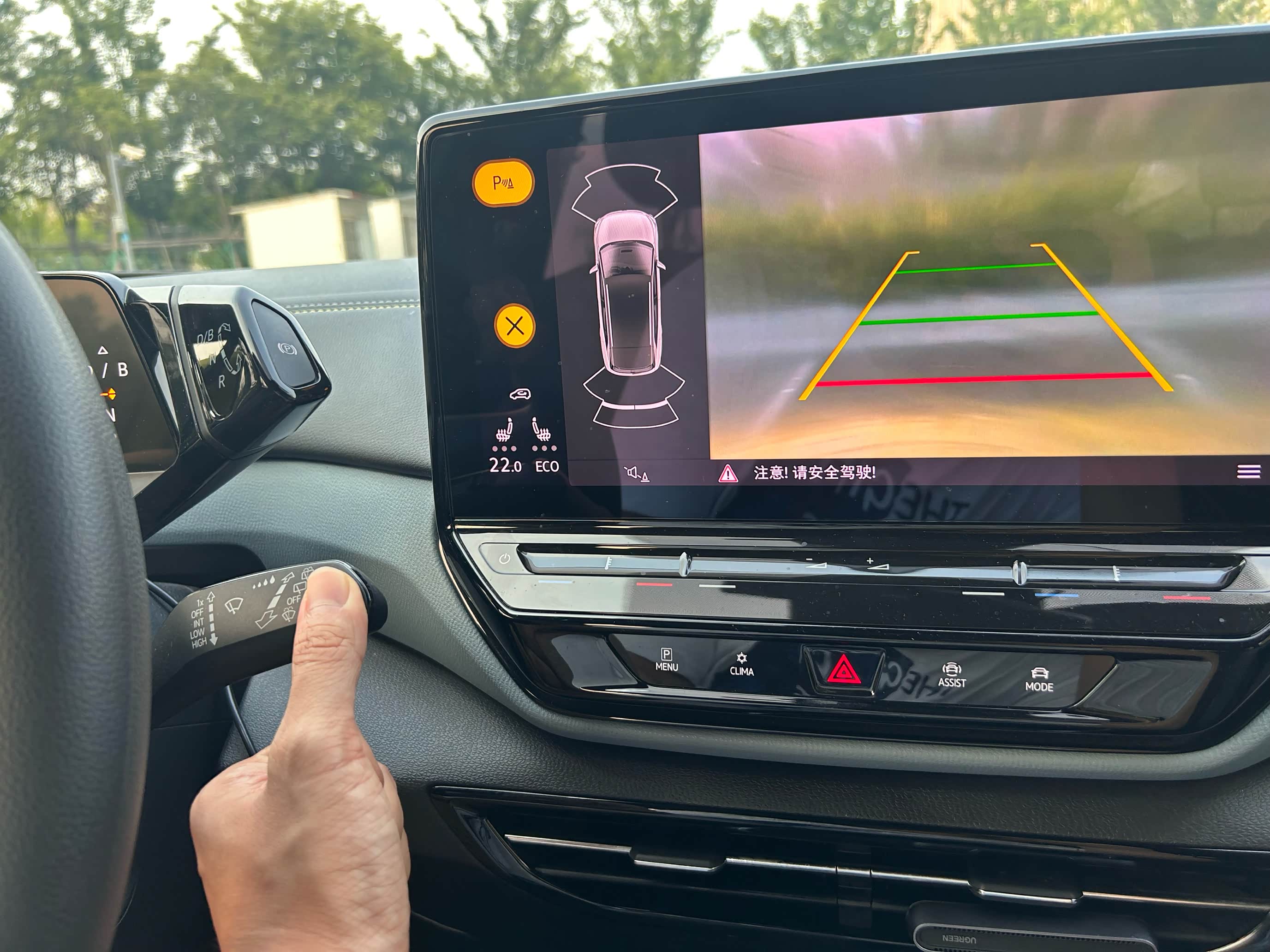 操作方法:点击中控屏幕下的MENU按钮,呼唤出我们的倒车影像,当然我们也可以挂R档进行唤醒,将右侧拨杆向行驶方向推动,并保持住,这个时候就会给我们的后风窗与倒车摄像头进行清洁。