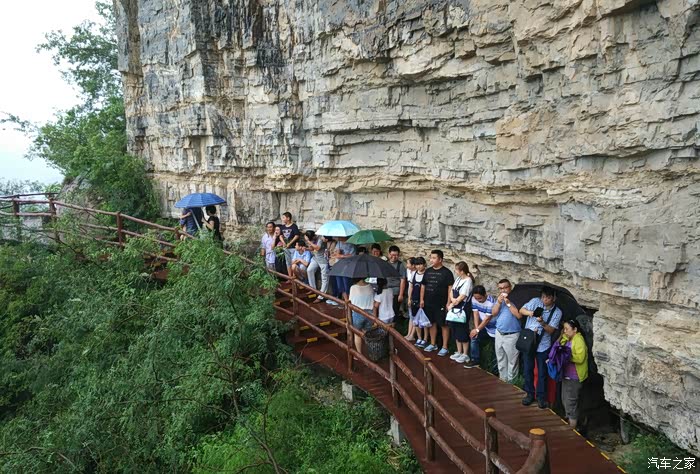 走了一会开始下雨,越来越大,只好找地方避雨。景区入口有提示:如遇特殊天气,玻璃栈道将关闭,而且不会退票。心想这下可糟了,等了好久雨才渐小,既然来了,怎么也要走到玻璃栈道啊。出发。