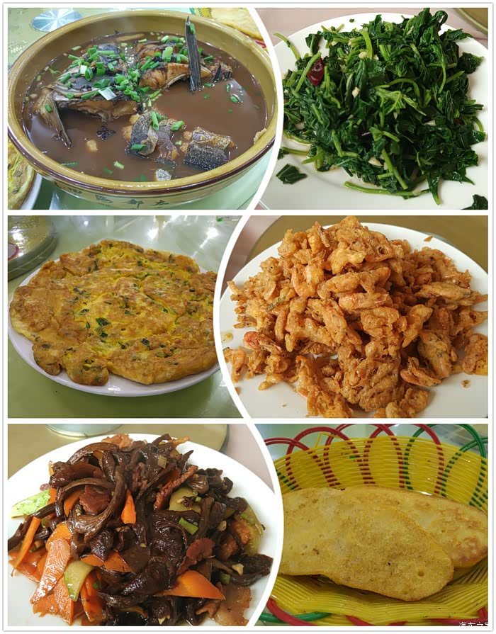 晚上吃了特色的铁锅炖鱼,水库里的大鱼很鲜美。炸河虾也是水库里的活虾。土鸡蛋金黄色,比超市鸡蛋的颜色好很多,顺手买了十斤带回去。野菜、山菌也不错,农家饭清淡、新鲜,很合口味。