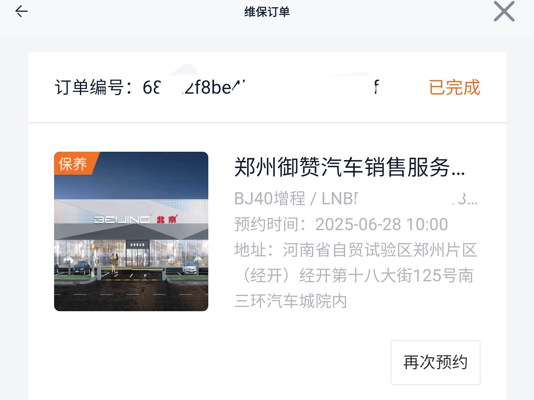 我是2025年5月14日于北京越野郑州御赞店提的车 。跑到5000km的时候,想起该做保养了,直接在官方APP悦野圈提交预约