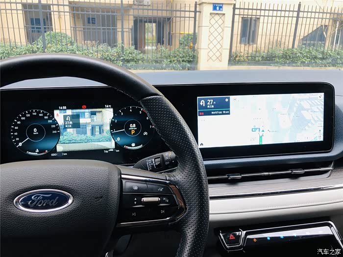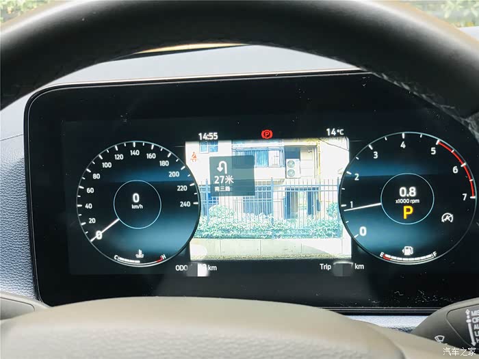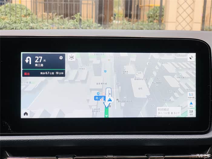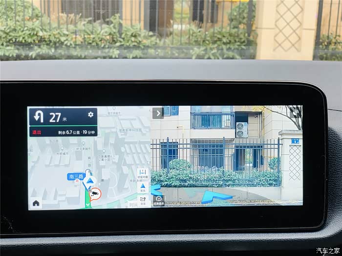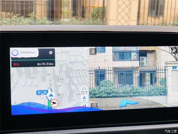 这样AR实景界面就会投到仪表盘中间,大概是7英寸的显示尺寸,也足够看清楚路况了,这时候中控屏上就是完整的平面/3D导航界面,可以配合着来看。