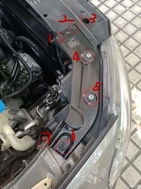大灯进水了,所以要拆下来检查问题出在哪里,大灯必须拆保险杠,或者拆中网,中网也是卡扣,拆掉上面三颗螺丝,如下图所圈,拆掉一排卡扣就可以了,中网卡扣比较难拆,需要手伸进去用东西顶一下,才容易拆掉。现在讲如何拆大灯,保险杠拆下来后,拆大灯非常简单,如图1.2.3.4.5.6.7个螺丝拆了,大灯就可以拿下来了,拿下来的大灯一定注意要用布包住前面镜片,我就没有包,地上蹭了好多划痕