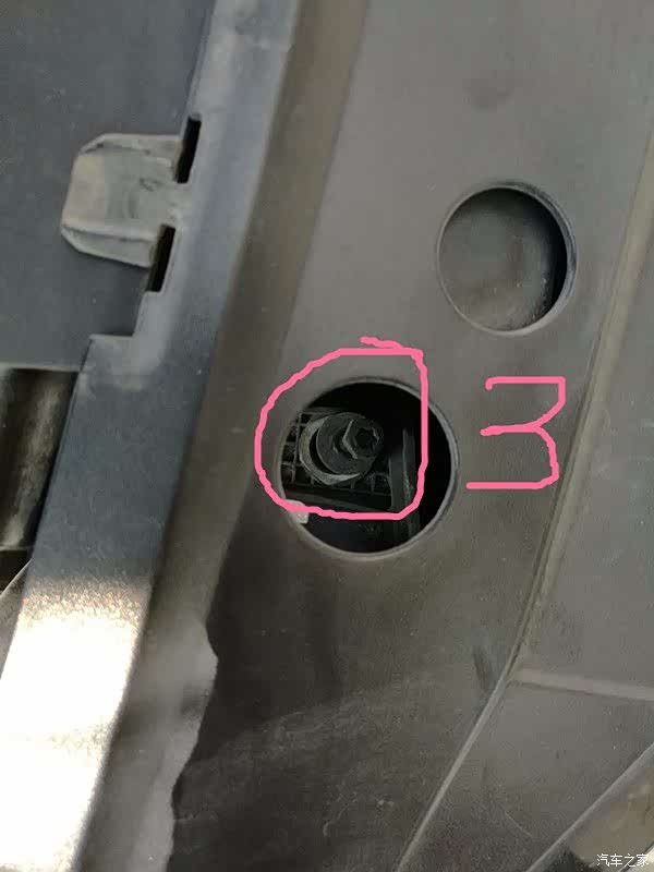 保险杠以卡扣安装为主,侧面轮拱和顶部有螺丝,顶部如图,需要拆掉1、2、3,拆完后的样子如图