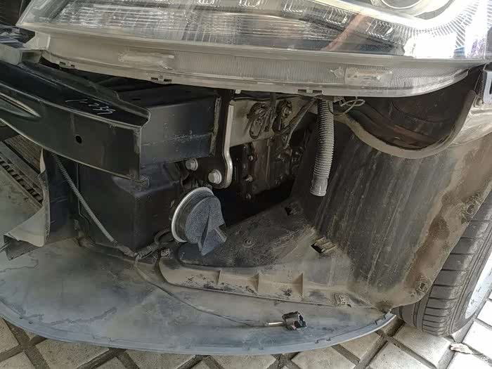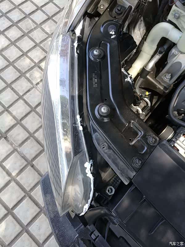 保险杠拆后的大灯样子,其实这是我搞完大灯装上去的样子。这里分享一下大灯进水个人处理方法,首先看看表面有没有破损,没有再看看四周打胶部分有没有脱胶,如果都没有,那就必须把大灯后面的盖子都拆下来,用电吹风或者暖风机吹有水的位置,直到烤干大灯,这个过程可能很长,然后搞一个大盆,装满水,把大灯前面各个部分依次放进水里,这里要注意,别把灯后面的孔放入水里了,一定要小心,如果那个部位进水,就是哪个部分有问题,具体问题具体查找,我的就是保险杠撞到地桩后,把大灯罩下面的挂钩给拉了一条裂纹,第一次以为胶没有打好,到处补胶,结果装上去,又进水,第二次拆下来才发现这条裂纹的,后来有A.B耐高温胶补了一下,好了
