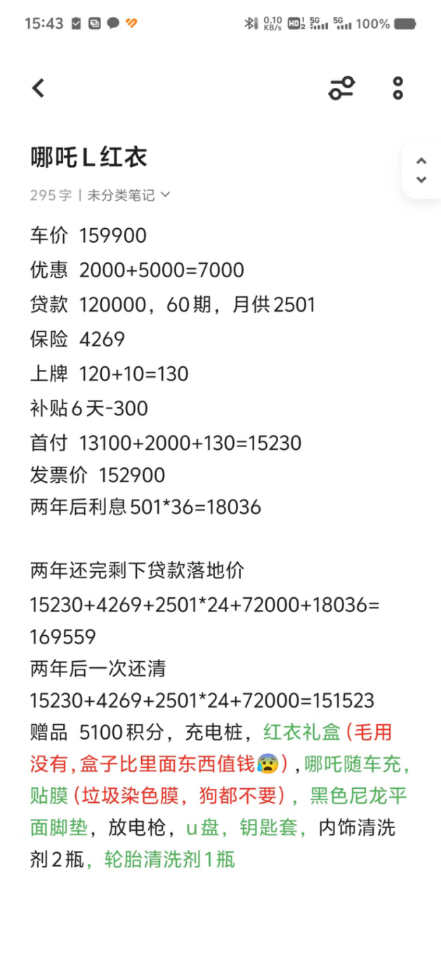 因为我所在地区银行有长贷短还的贷款方案,所以我如果2年之后还清落地价格就是151523,这个价格还是很香的!说明一点:我是5月5日下定,车是6月11号到店,不算下定和到车当天,用时36天,所以延期交付6天,补贴300元。顺便说一句,各地区政策不一样,基本上大部分车友提车价格就是152900+保险(地区不同4000-6000之间)+上牌(车管所落户费用120,10元临牌费),其他的什么金融服务费,提车服务费,高额上牌费都可以谈,谈不下来就换销售,换了销售不行就换店,不能惯着!另外厂家提供10万2年或6.6万3年免息,这个就是厂家宣传的5000元金融政策。