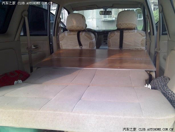 之二的中座靠背向前放平后太单薄,当床使用不可靠。原想拆开加层沙发海绵。但那样只能仅仅放心地当床用,而俺并不满足于此,就重新琢磨了一下。先上图:
