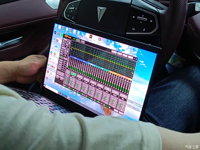 ④调音!将车机安装回去后,调音工程师就开始进行音场调试了。我坐车车里观察了十分钟不到就受不了了。调音工程师用的专用音频文件,将声音调节到我平时音量的两到三倍进行。只见他坐在我平常坐的位置上,听着放的音频文件,逐项调整参数曲线。看着甚是细致繁琐。不过好在调音完成后,后续车辆可以直接使用配置文件一键烧录。