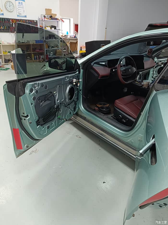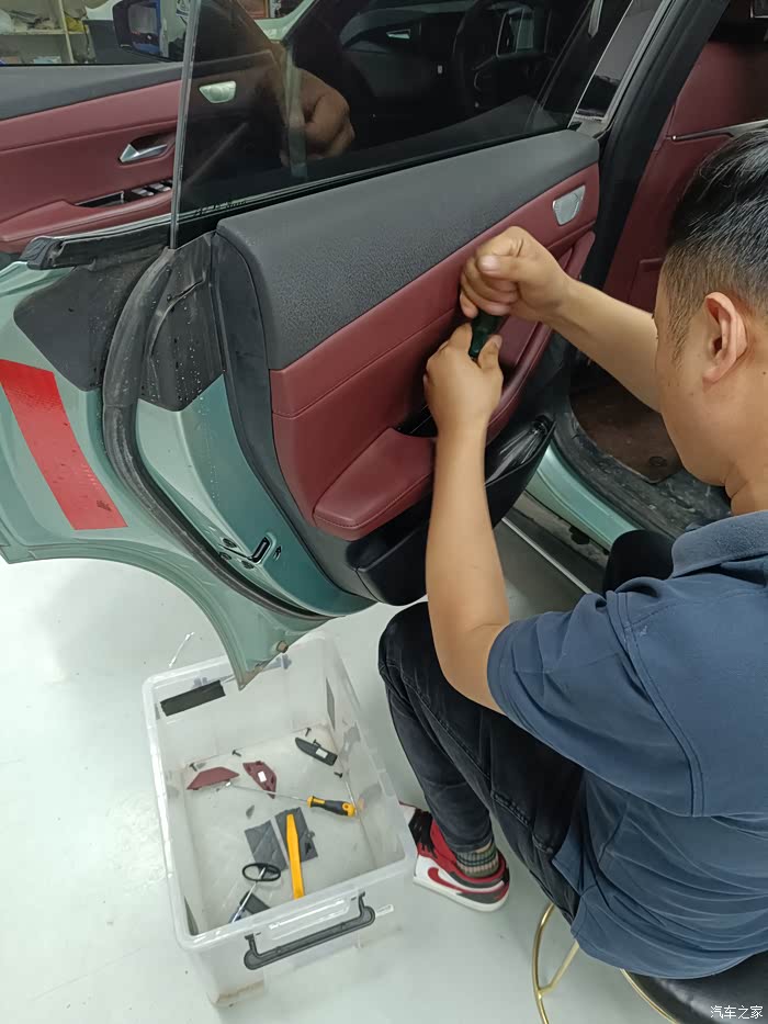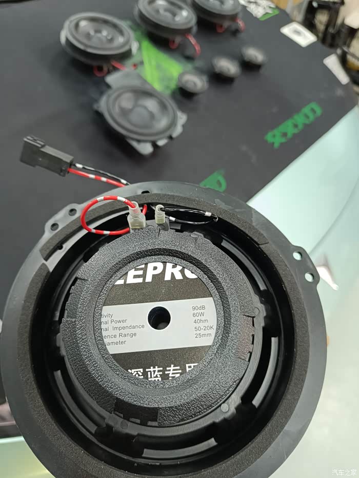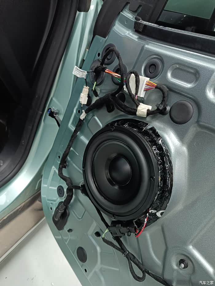 四个车门依次重复操作,则四个车门的高音和中音喇叭升级完毕。这些操作都是不做任何破坏原厂件的:原厂插件对插,原螺丝孔位固定螺丝。车门的八个喇叭有六个周边用顶级密封胶带进行了密封,后排左右的两个高音喇叭没有密封。厂家解释是后排高音为了音场不做密封定向,而前排两个密封是方向定向到主驾位。也就是后续调音工程师说的车内音场的皇帝位。