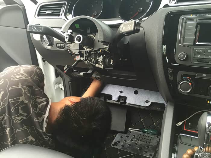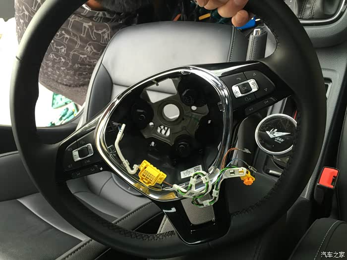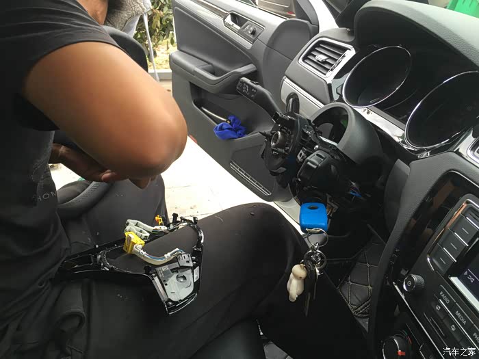 方向盘比较难拆,花了半个小时,哎,其实这东西有窍门的,建议大家最好找专业点的汽修师傅拆,他们一般几分钟搞定,我这师傅拆了半个多小时,还搞得自己很专业的样子,其实我看着就觉得不专业了····可恨的是还收了我200安装费···吭····