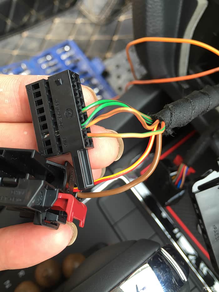转接线的两根橘黄色的线,安装的时候要拆空调面板,然后转接线和空调面板后面这里的2根橘黄色的线并联(就是绿色边上这2根),1.6的没有预留孔位,所以只能破一点线了,然后把转接线接到上面,1.4T的车主就不用破线了,原车预留了针脚,具体的可以咨询卖家了。