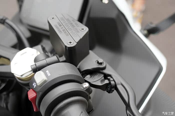 仪表显示屏左上角除了时间还显示了当前动力模式,与之配套的模式选择键当然也在会在右侧的车把开关上。这个按键位置刚好是250RR上TCS开关的位置,不过如果我们仔细观察MODE动力模式键的上方可以隐约发现一个预留出的同样形状按键开关位置,量产定型时RR525在这儿长出一个新的TCS开关也是很有可能的。这台RR525试装车目前采用了来自航特品牌的可调间距侧推上泵。