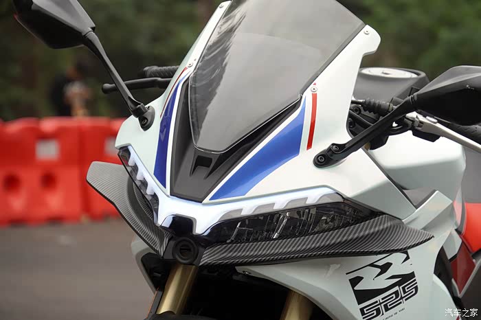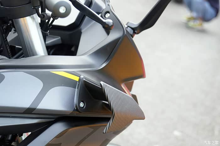 外侧翼片使用了碳纤纹理喷涂,从后方能看到是采用内六角螺丝进行固定的,牢固程度当然不成问题。从车头正面看过去我们能发现250RR车头的风挡造型也进行过调整。风挡玻璃中部呈半圆状向上拱起,提升了约6-8cm高度,在车手压低上身进行直线加速时能提供更好的头部风阻保护。