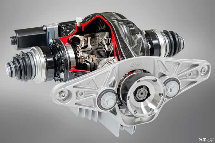 下面我就介绍一下这个主动M差速器的大概原理,差速器本体是由一组多片离合器组成的磨片式限滑差速器,它由电机进行控制可以实现从0-100%锁止率的切换。当然锁止率越大,电机旋转所产生对多片离合器组的压力越大并保障两边车轮相同转速。