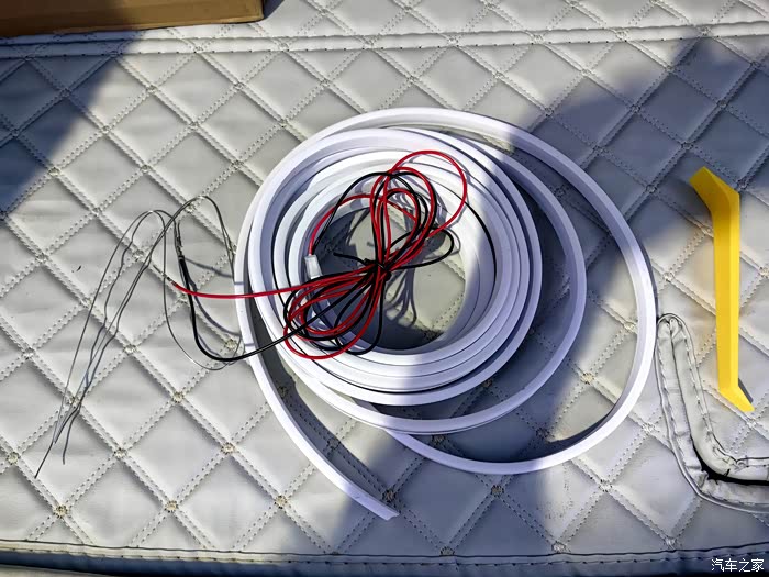 4.然后灯带走线了,很简单但也耗时,用撬杆翘起密封条后,将灯带塞进去就行,但要注意灯带的正反面,一定要将灯带发光位置朝外塞进密封条中,不然影响光源的亮度。