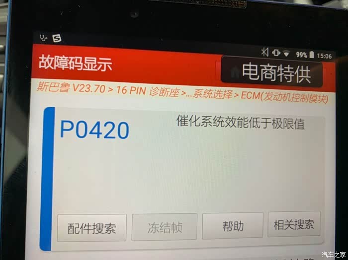 接电脑检测故障代码为P0420催化效能低于阀值,估计你去4S店检查出来这个故障就让你换三元催化了,小10000元,心疼吧,不换亮故障灯就会影响行车安全,因为侧滑灯亮着,那么ABS就不会工作了,不安全,不过我们能解决这个问题。显示这个故障主要是因为催化器催化效能太低了,就是说催化器堵了,经过催化器的废气没有净化就排出了,后氧传感器检测到以电信号传给发动机电脑,电脑就会报出故障,好了,堵了就清洗呗,不过你们会问,怎么清洗,打吊瓶还是拆下来草酸泡啊,nonono,打吊瓶一点用都没有,草酸泡了催化器就报废了,当然啦,我们用的是黑科技啦,哈哈,有点夸张,不过就专治催化器堵,叫做“水”洗三元,下面是清洗的情景