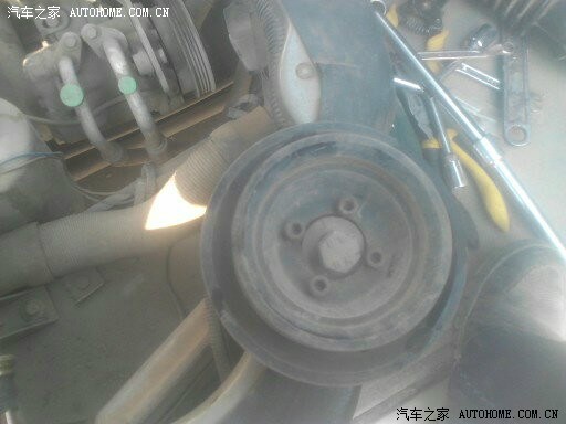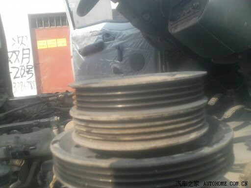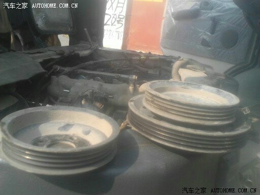 拆皮带盘。自己加工的大小轮。带水泵和发电机的是原装的。前边的小的是水泵皮带轮。加工到一起就是这样了