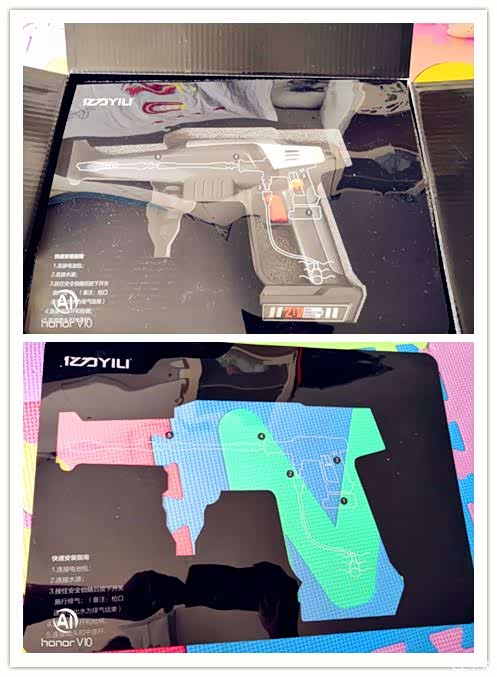打开盖子,映入眼帘的是一张黑色的膜,在枪身部分***显示出前身外观,其他位置黑色遮挡,很有创意,膜上还印有“快速安装指南”