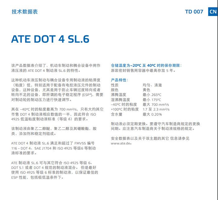 原厂要求DOT4 plus级别刹车油,但看了ATE 竞技版DOT4的指标数据更好,干沸点280,湿沸点198,今天就改换了ATE的,请问换过的朋友这款刹车油长效性怎样?附上官网的数据,SL6粘度比竞技版粘度低很多,不知实际使用区别怎样