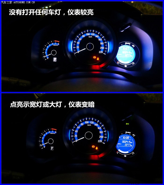 ▼新飞度仪表分两种,低配是橙色,其余均为蓝色仪表(如图),仪表漂亮新颖,对于这个全新进化的仪表,很多车主都表示喜欢。示宽灯或大灯点亮时,仪表变暗,能有效避免夜间光线太强影响驾驶。