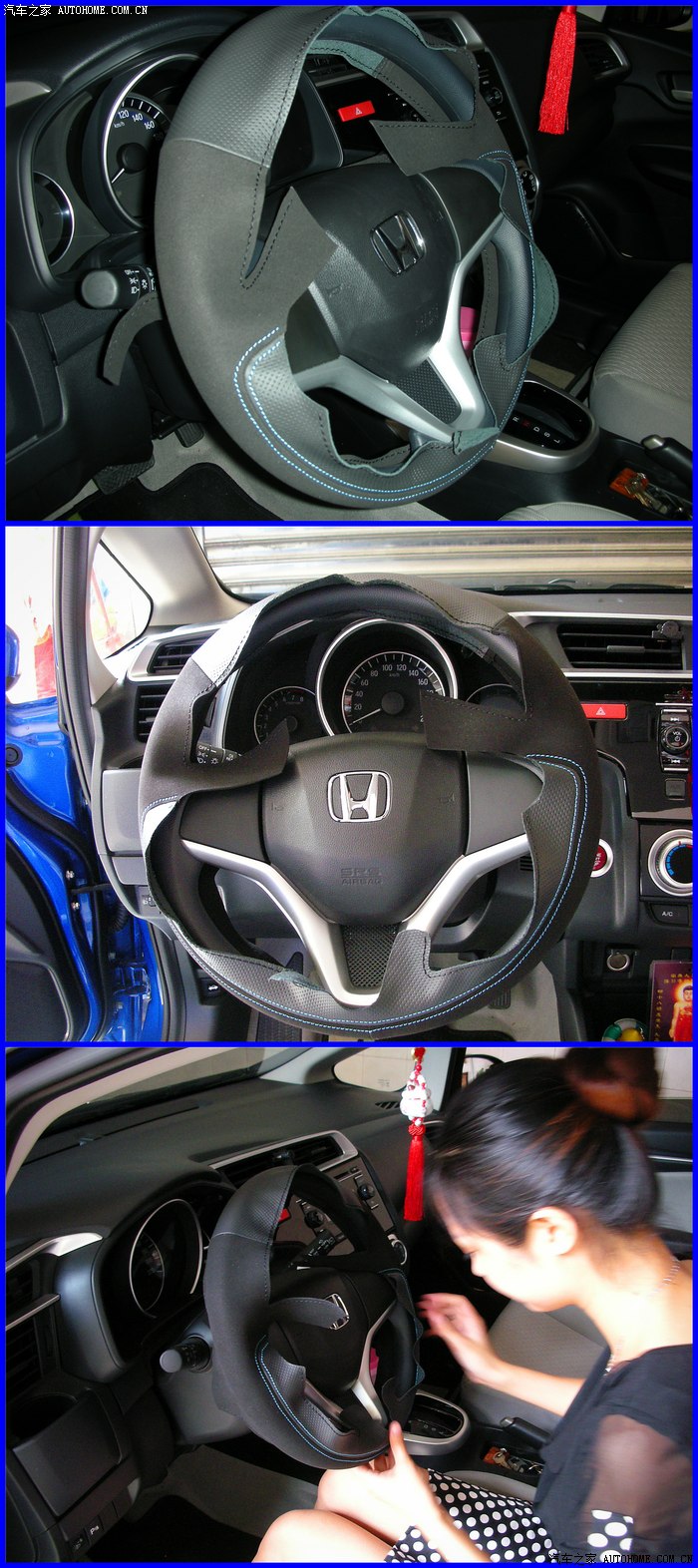 ▲新飞度方向盘轻巧,略有虚位。太滑太细,手感不好,在等待一段时间后,网上终于出现手缝方向盘皮套。我这个是皮和翻毛皮结合的定制款皮套,手感极好,但缝制过程实在揪心啊。下面几张是媳妇缝制时拍的图。最后完成时三点方向有瑕疵,但不影响使用。