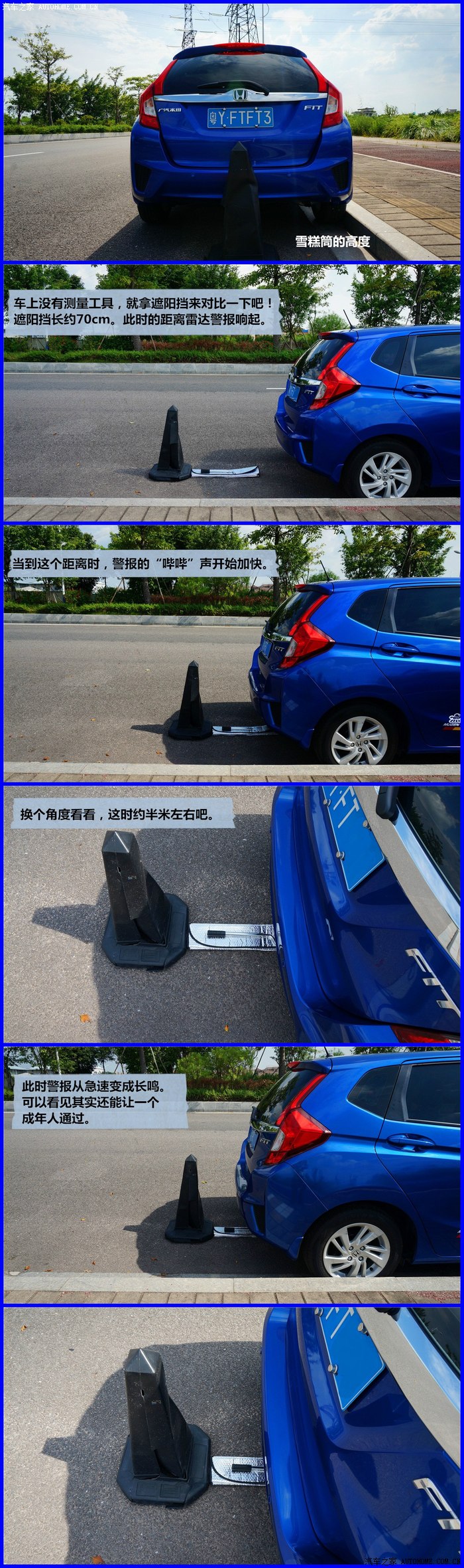 新飞度精英版配有倒车雷达,合计四个雷达探头,左右两侧探头高于中间的两个,在日常使用中,灵敏度可以。下图是模拟车辆正后方有障碍物时,雷达开始作用的距离和不同警报声下的距离。(因道路情况这次没有测试侧后方的距离)