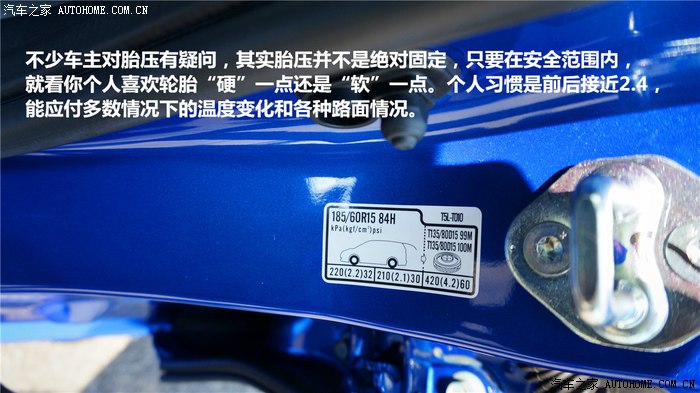 ▲轮胎胎压也是很多人谈及的点,不少人对门框上的胎压数值表示不解,我早年刚开始开车时一直都是使用胎压表上标示的数值,车辆静止时能看到轮胎略微扁平,但这是正常的,后一直使用2.4左右的气压,感觉更合适。当然,这是在正常合理的使用环境下的“合适气压”。