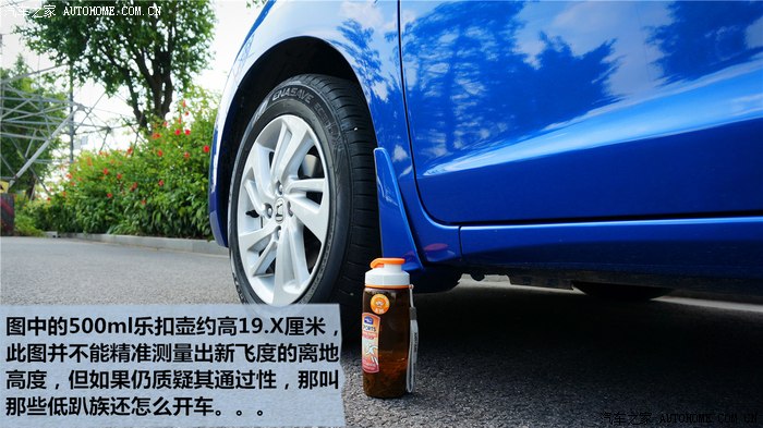 ▲很多人质疑或者主观认为新飞度离地很低,其实新飞度的通过性根本没有太大的问题。由于道具不足且环境不太合适,我无法钻到车底拍摄到底盘最低的位置(大概在引擎下方)。d2,yellow,bc等众多改件被追捧使用,不也开的好好的么,原装车比他们都高吧。