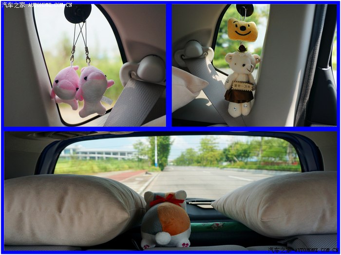 ▲后排。我是爱猫人士,所以放了个猫公仔(其实还有一只很大的,送给媳妇了),有看动漫的人应该知道这只猫。两个小窗挂着的,是以前跟媳妇去婚博会时拿的,她说要挂车里,那就挂着呗~
