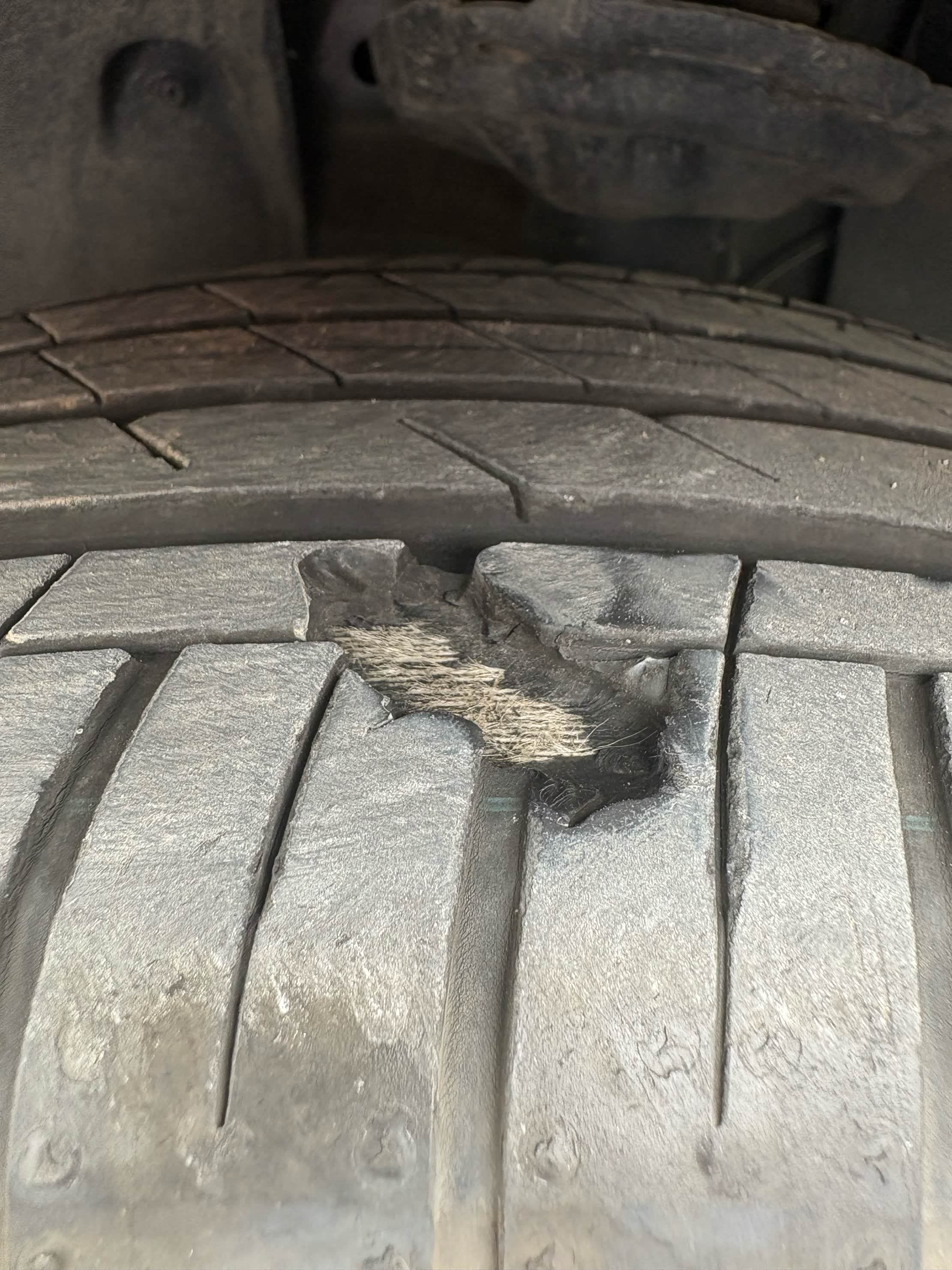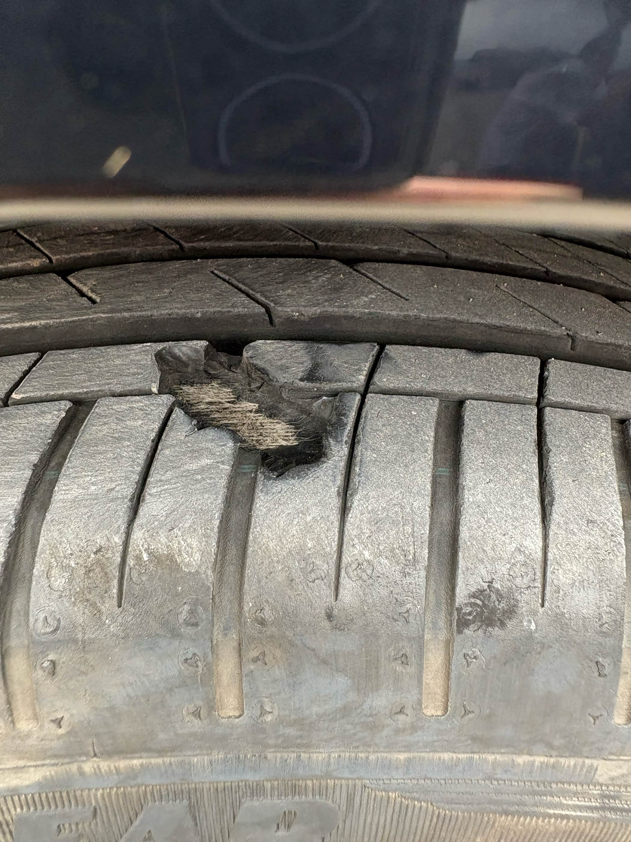 迈腾10000公里轮胎出现脱落,咨询过4S店不能判断出什么原因造成的,轮胎胎面出现直径约3-5cm的楔形橡胶块脱落(附照片),内部帘布层完全暴露,伴随周边放射状裂纹。