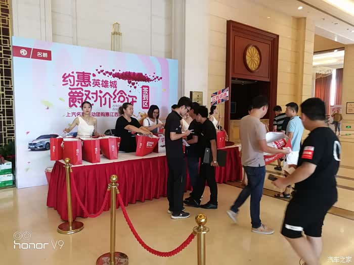自从上次看过车之后,有对比了几家车型感觉MG的车子还是不错的,而且名爵4S店的销售顾问给我们电话说在8月18号有酒店团购会,是上汽厂家组织的、优惠比较大;于是我们18号就先来到了4S店,这次一家男女老少基本都来了;在展厅转了一会就坐车去5星级的酒店(本人第一次去),外观不像是那种高楼大厦而是感觉很有中国特色的,里面更是富丽堂皇啊,大灯特别豪华。