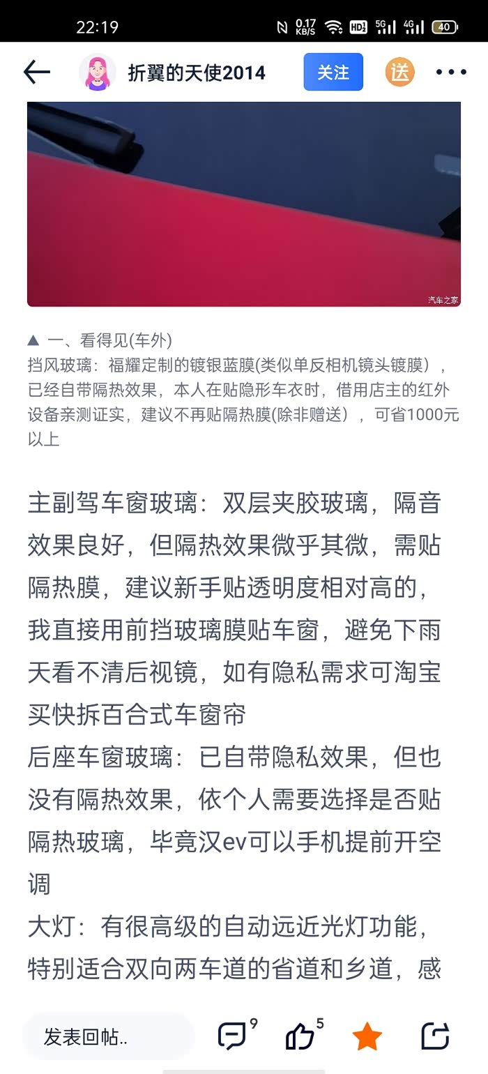 网上学习了很多,很多说汉的玻璃用的很高档,不需要再贴,也有用仪器测试的,还认真学习了《汉ev功能与体验报告(6年新能源车主详解)》这篇帖子,差点也就采取了这位车主的说法。不得不说,这样的车主发的帖子,还是很有交流讨论借鉴的积极意义的,我也经常学习。