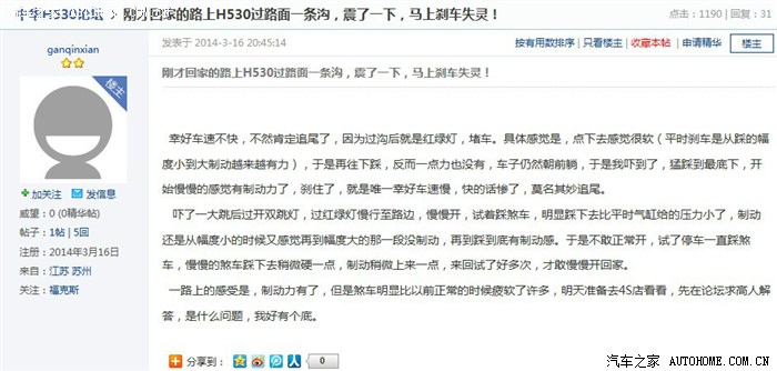 发现一个H530的问题,刹车安全问题,希望华晨重视。