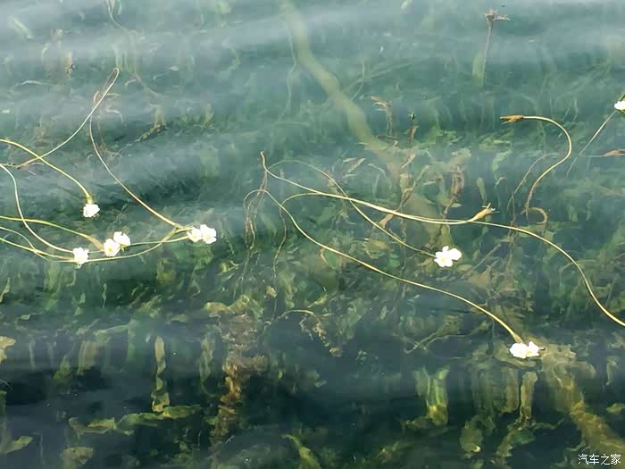 近处一看,原来是水生植物,根在下边,水面漂浮的是白色小花