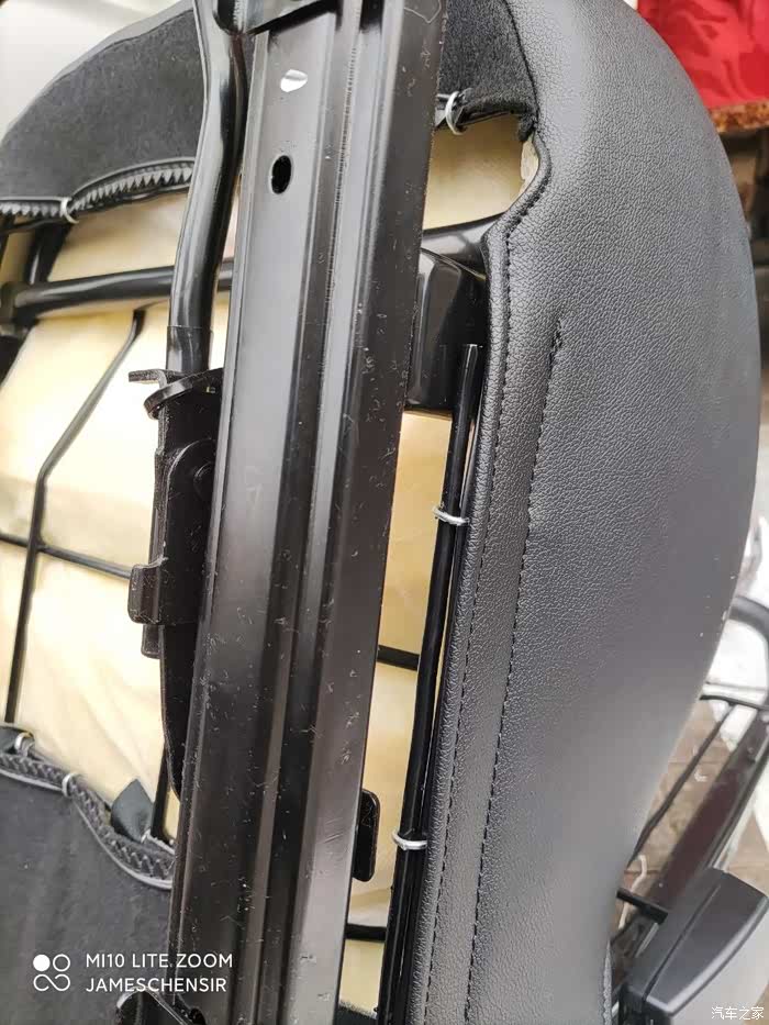 首先将副驾驶座椅从车中拆下,接下来就是将座椅蒙皮全部拆掉,19款座椅靠背上部有一个孔,用手抓住银色外壳上面的边,用力向后拉,即可将外壳拆掉。