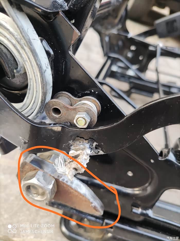 接下来在坐椅右侧靠背调节器处靠背限位器位置同样打一个孔,将刹车线固定后穿入,在坐椅骨架后限位器处和偏心轮上方合适位置分别打一个孔用来固定刹车线外皮,靠背调节拉杆上原厂有一个孔,这个孔对应上方坐椅骨架上也有一个孔,将8毫米螺丝从内侧穿进坐椅骨架孔内,外部用一颗螺母固定,外面再放一个摩托车链条扣,最外面螺母拧紧,将刹车线穿入外皮后到达链条扣中然后折向下连接到靠背调节拉杆自带的孔里,,固定时确保靠背处于前倾位,同时靠背调节拉板处于最高位,这样可以实现靠背前倾时不需要额外抬起靠背调节拉杆就可以将靠背向后推起,向后推靠背的同时刹车线带动靠背调节拉杆缓慢下降,待靠背差不多推到与地面垂直状态时拷贝调节拉杆也起作用了,就会卡住靠背,不让其前倾和继续向后。一般我们坐车上,靠背都是向后倾斜的,所以靠背90度卡死不影响正常乘坐,也不影响驾驶员观察右侧后视镜。