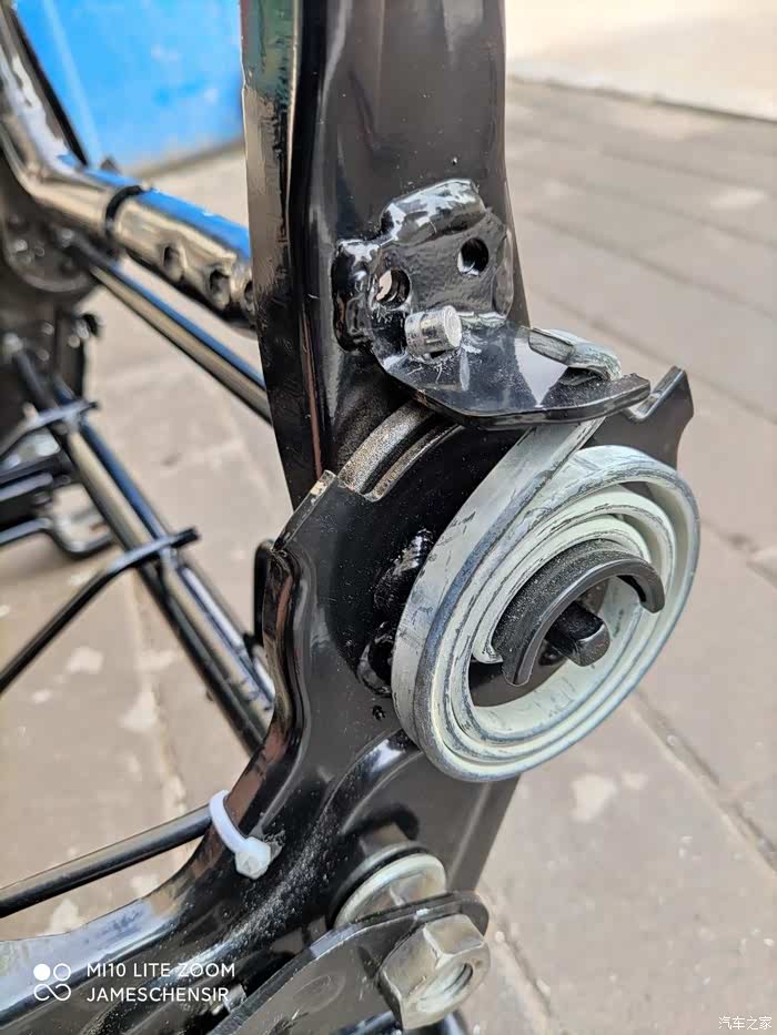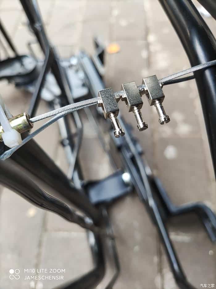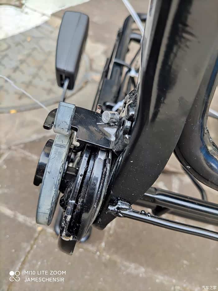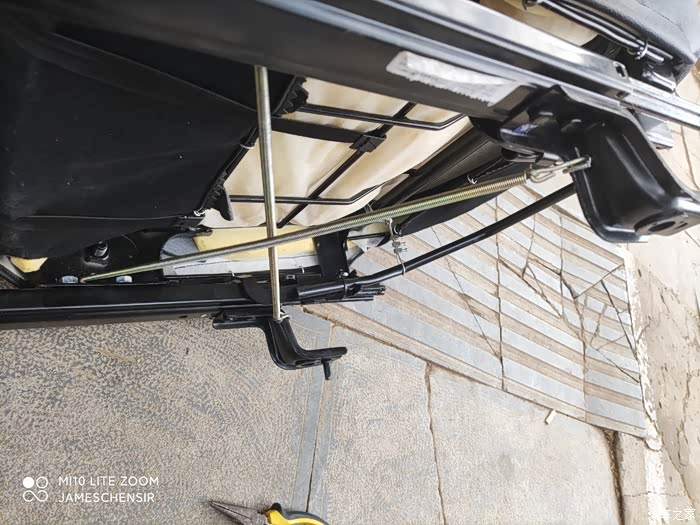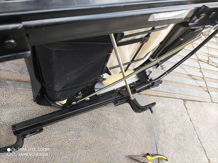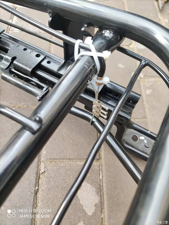 在坐椅左侧靠背调节器处靠背限位器上打一个孔,将刹车线端头穿进去,在目前安全带底座前上方合适位置打一个孔,用于固定刹车线外皮,刹车线绕着转轴内侧向后下方再向前延伸,在平行段套上刹车线自带的外皮,将刹车线牵引到坐椅骨架前端滑道拉杆处进行连接,其实应该用专用的线夹,我们当地实体店没有,我用接线端子代替,不过因为接线端子固定力太弱,我后期用哥俩好胶水又涂了一遍,连接时确保靠背位于前倾位,滑道拉杆位于最顶端,将刹车线外皮用扎带固定在骨架上,这样靠背前倾后刹车线会将滑道拉杆拉起,实现靠背前倾,滑道拉杆提起,可以前后自由推拉坐椅。