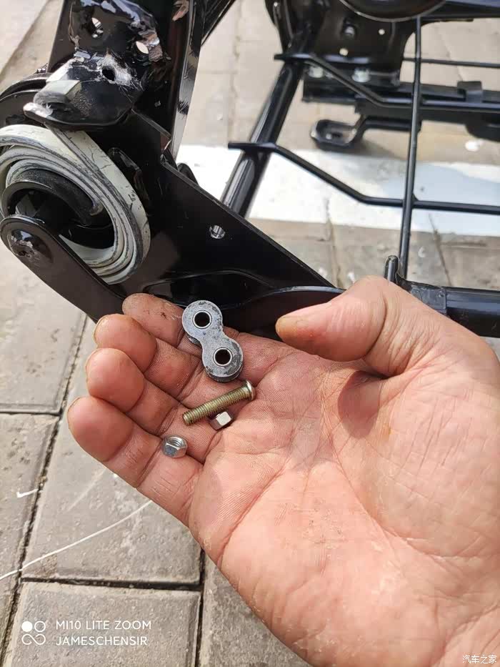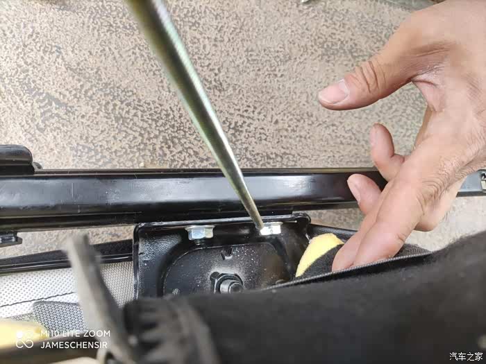 制作好偏心轮后,将偏心轮安装在靠背调节拉杆下面螺杆露出的端头,安装前先放几个垫片,我放了两个,大家看自己螺杆的长度自行放垫片就行了,偏心轮两端同样用螺母拧死,这样就可以通过操作坐椅内侧副驾驶安全带底座就能带动偏心轮转动,从而顶起拷贝调节拉杆,实现靠背向前倾的目的。