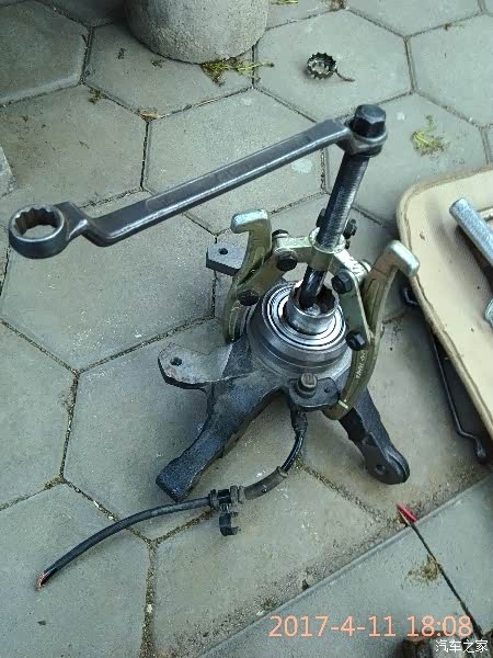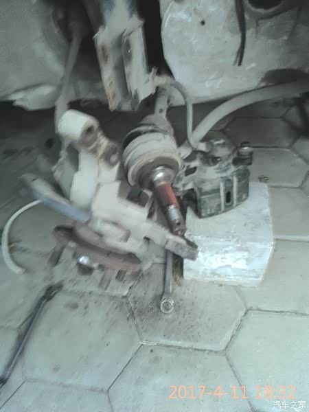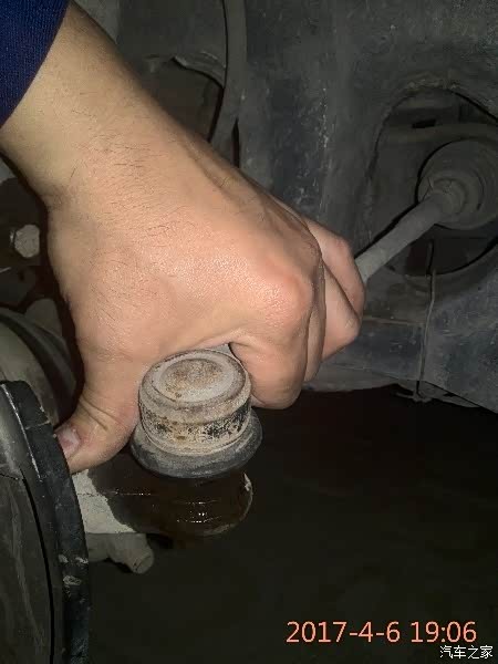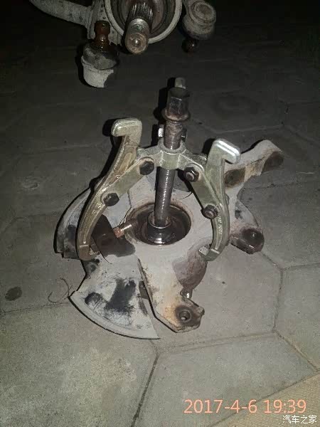 原车的羊角总成拆下来了,我需要原车的前防尘罩,买一个20多元,不值当的,用原车的吧。用大拉马把原车前哈头顶出去,很轻松!
