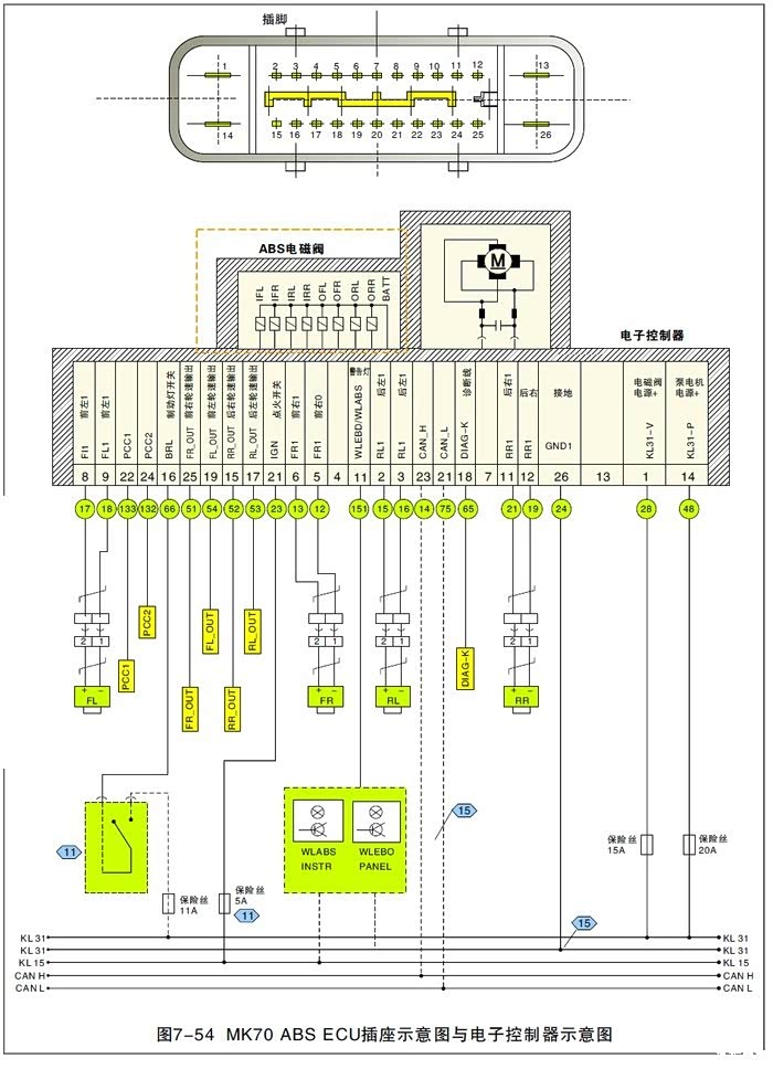 看一看ABS泵的接线,还好,就四个传感器的线、正极、搭铁、点火信号、刹车信号、ABS指示灯线。还算简单啦!